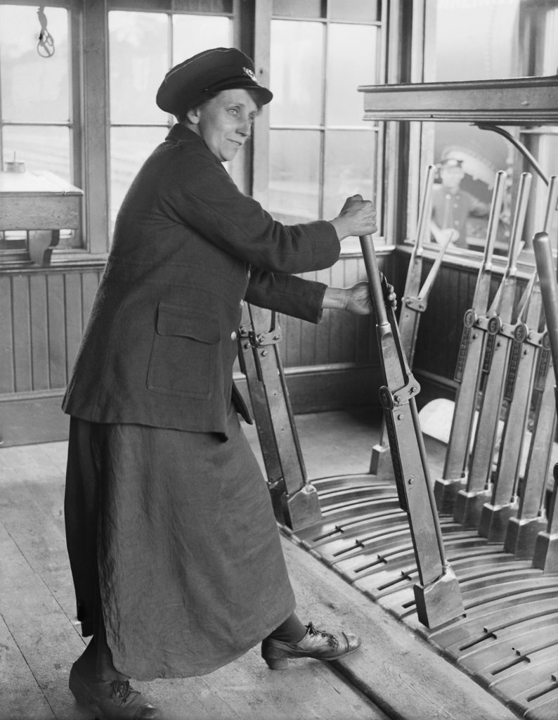 Une « aiguilleuse » près de Birmingham en 1918. En France en 2025 bon nombre de postes d’aiguillage sont encore manuels, composés de leviers, de poulies et de câbles.