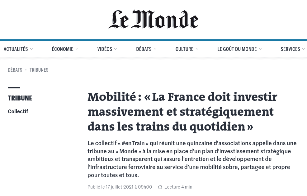 17 juillet 2021 : Publication de notre première Tribune dans le Monde By La Rédaction22 mai 202324 juin 2023Presse L’article dans Le Monde Toutes et tous en train (PDF)