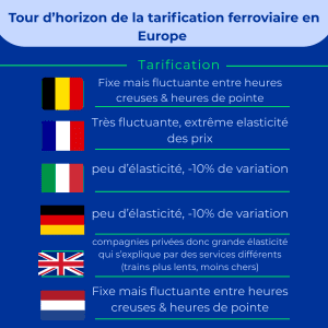 En Europe, l’opérateur qui a poussé le plus loin cette logique aérienne est probablement la SNCF, au point qu’un de ses commerciaux parlait, à propos des tarifs, d’un saut de Fosbury, du nom du champion américain de saut en hauteur qui a élaboré une technique où on commence le saut le plus bas possible pour le terminer le plus haut possible. De la même manière, en matière tarifaire, l’écart entre le tarif le plus bas et le tarif le plus haut est souvent très élevé. La SNCF a mis en place cette décorrélation très poussée d’avec la distance en 1993, au moment du lancement du TGV Nord, l’a ensuite progressivement généralisé à l’ensemble des TGV, puis aux trains Intercités et même à certains TER.