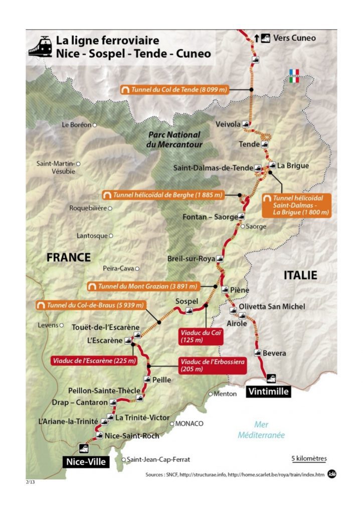 La ligne Nice – Breil-sur-Roya en est un douloureux exemple. Longue de 44 kilomètres, elle compte de nombreux tunnels, ponts et viaducs ; de Breil, deux autres lignes à caractère transfrontalier rejoignent l’Italie, l’une vers le Nord, par le Tunnel de Tende (long de plus de huit kilomètres !) vers Cuneo et Turin, l’autre vers le Sud, jusqu’à la ville frontalière de Vintimille, où elle assure la correspondance avec les trains de la ligne côtière. La carte ci-après montre le tracé des lignes.